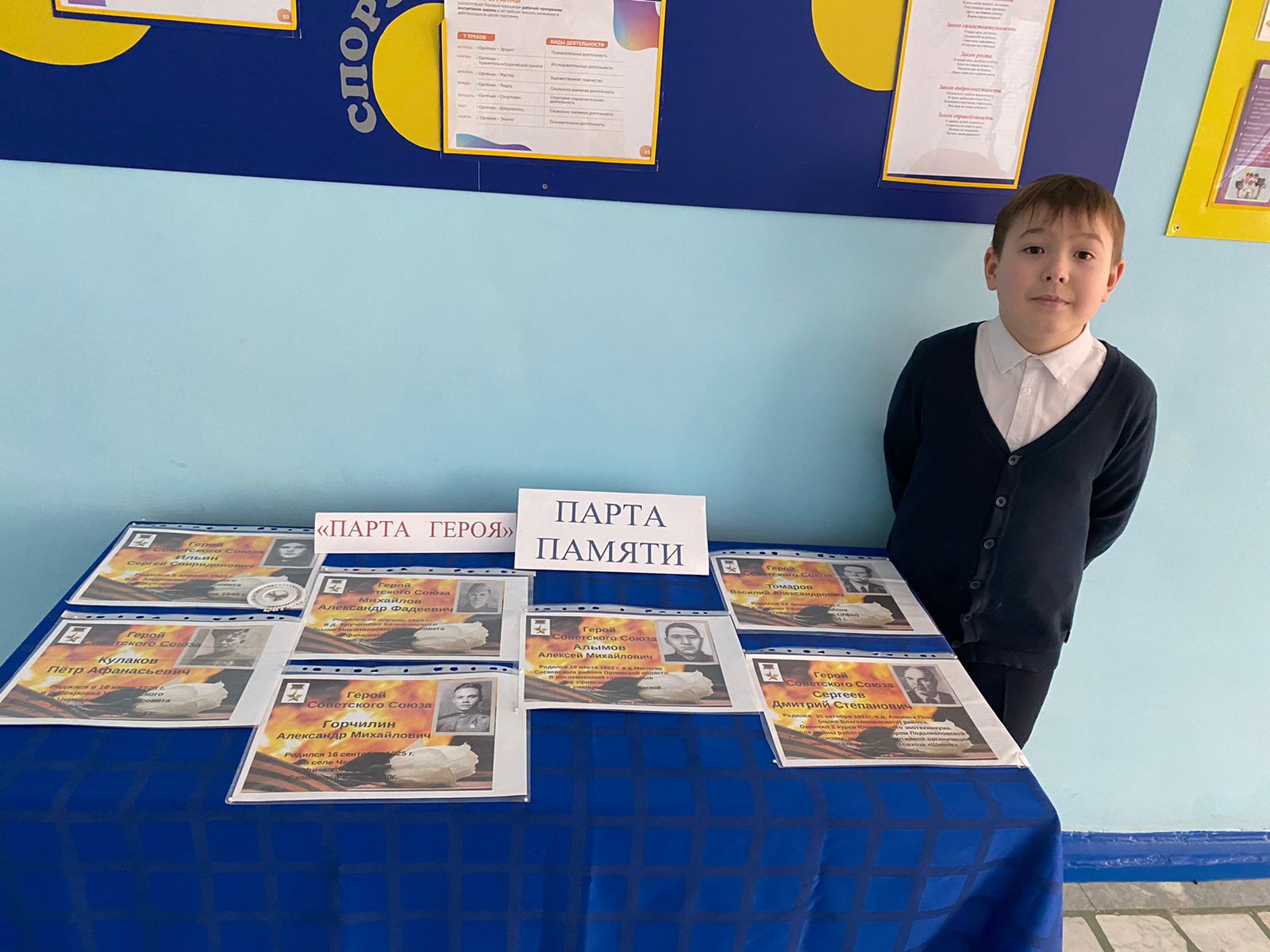 В школе на каждом этаже организована акция Парта памяти". Где на каждой парте дети могут познакомиться с героями нашего района.