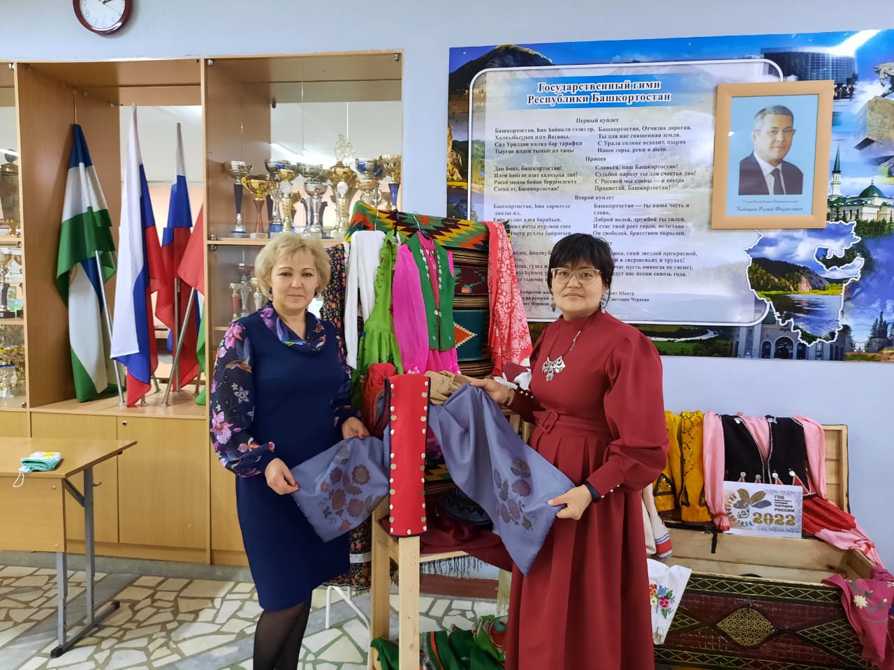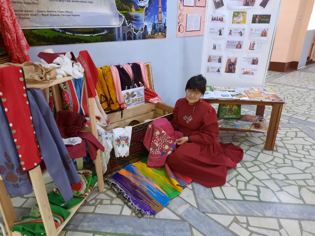 Книжную и костюмированную выставку "День национального костюма" и урок в 4г и 5абвг на тему " Национальный костюм башкир" оформила и провела Хайруллина Г.Р. Обучающиеся для выполнения проекта должны были познакомится с башкирским костюмом, разгадать ребусы и составить проект. Фотосессия в национальных костюмах и элементах костюма на фоне выставки.